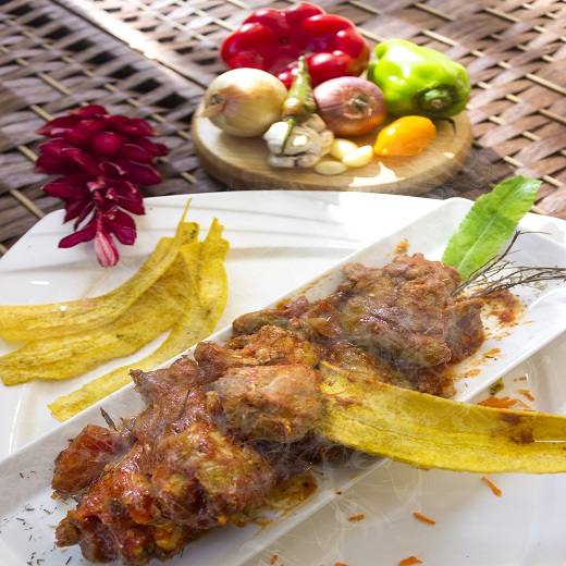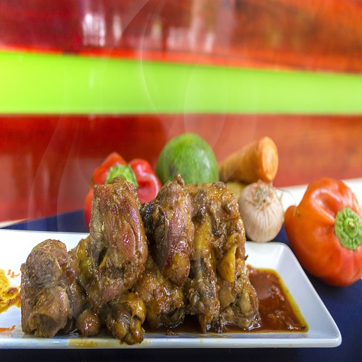 Pollo asado en salsa calipso (tipo barbecue semidulce) que mezcla ingredientes de 15 países del CARICOM. Acompañado de arroz congrís del caribe y plátano maduro frito.