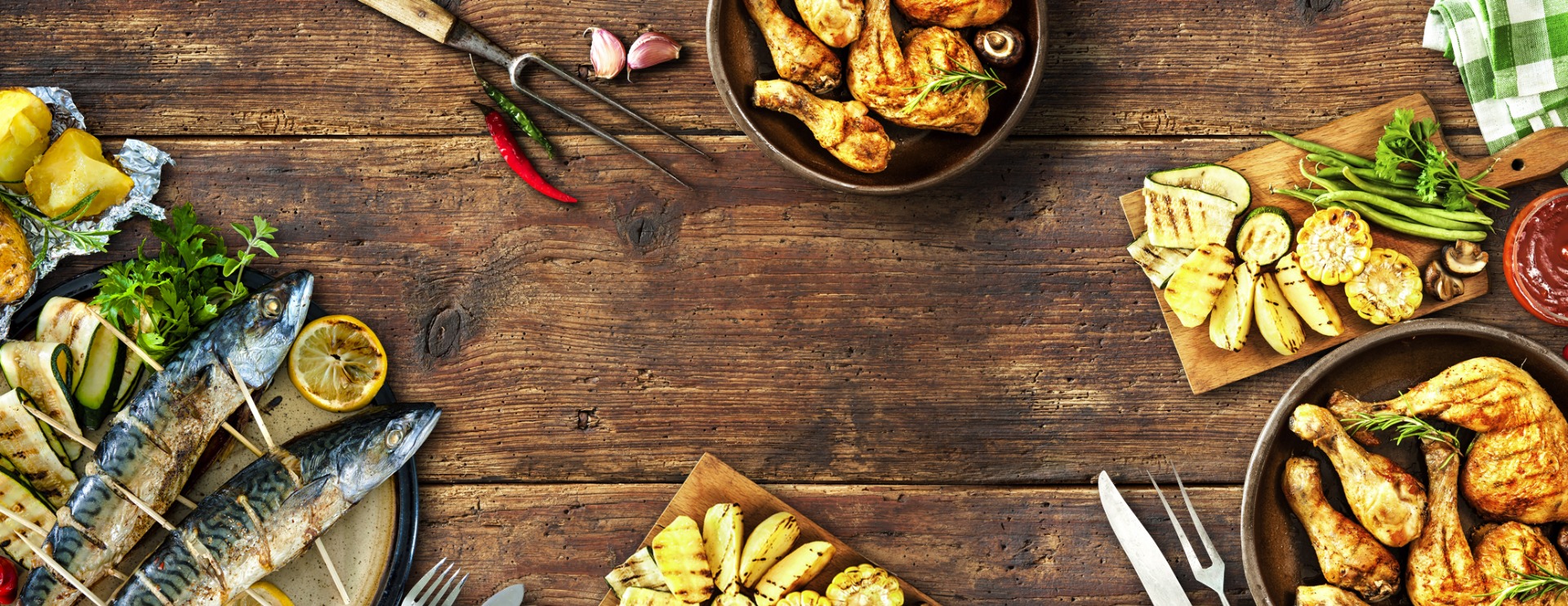 Pescado, camarón y langosta asados en papel de aluminio con vegetales y plátano maduro al estilo de Bahamas, acompañado de arroz blanco